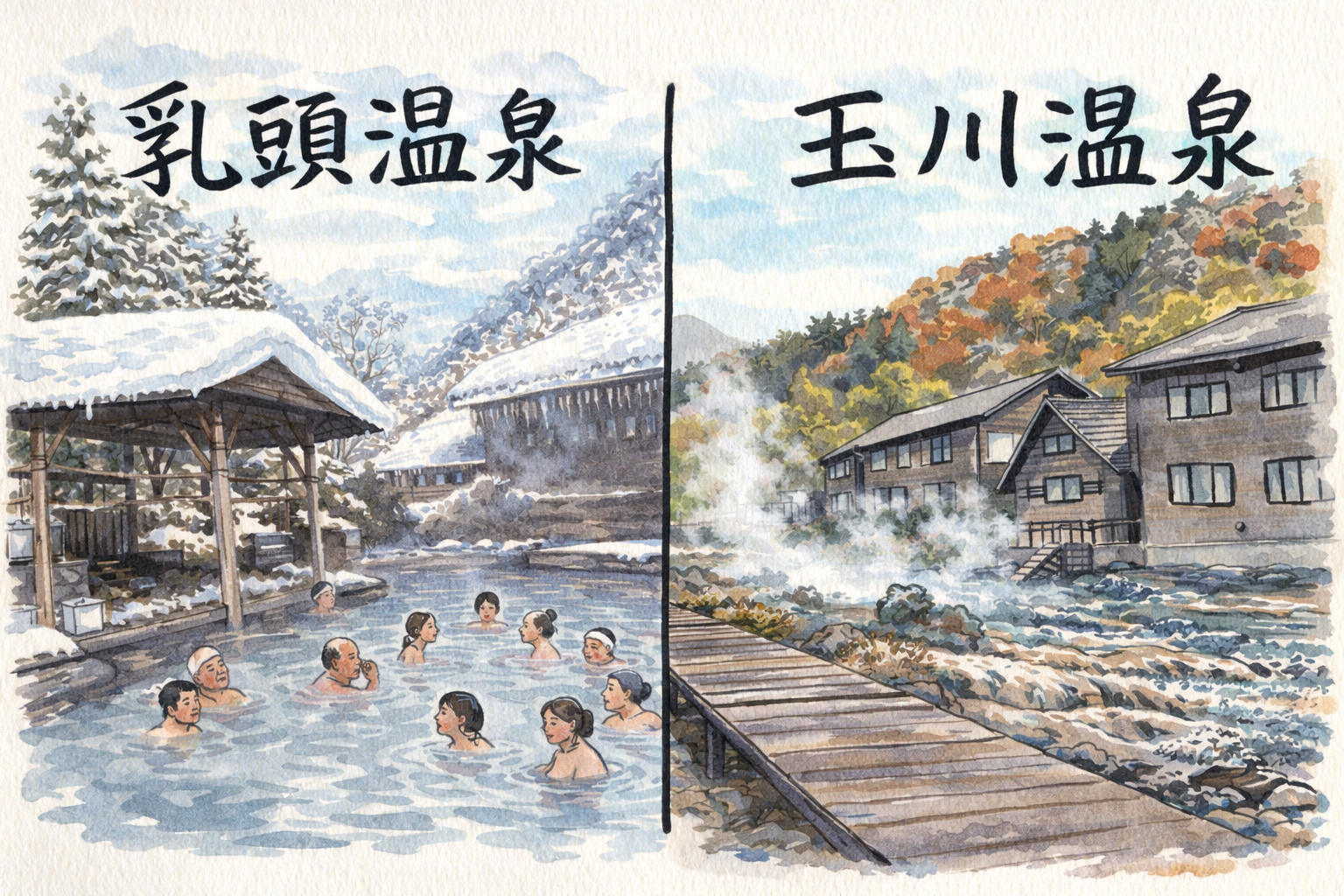 秋田・乳頭温泉郷と秋田・玉川温泉、どっちが自分に合う?違いと特徴を、温泉街の雰囲気や外湯めぐりの楽しみ方、宿選び、東京からのアクセス、周辺観光までまとめて解決します。