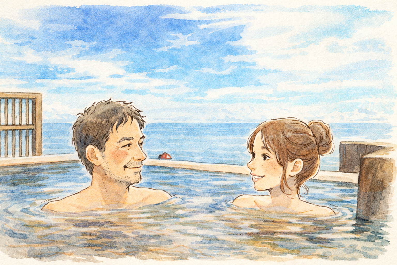 鴨川温泉の魅力は、にぎやかさよりも落ち着きにあります。秋・冬は空気が澄み、海の青さや空の広がりがよりきれいに感じやすくなります。夏の海辺のようなにぎわいとは違い、静かに景色を眺めながら過ごしたい二人にはちょうどよい季節です。宿で温泉に入り、窓の外の海を見て、少し外を歩いてまた戻る。そんなゆったりした流れが似合います。温泉街を次々歩いて楽しむ旅というより、宿での時間を中心にしながら、その土地の風景を少しずつ味わう旅向きです。せわしない日常から少し離れたいときにも、鴨川温泉の静かな空気は心地よく感じられるでしょう。