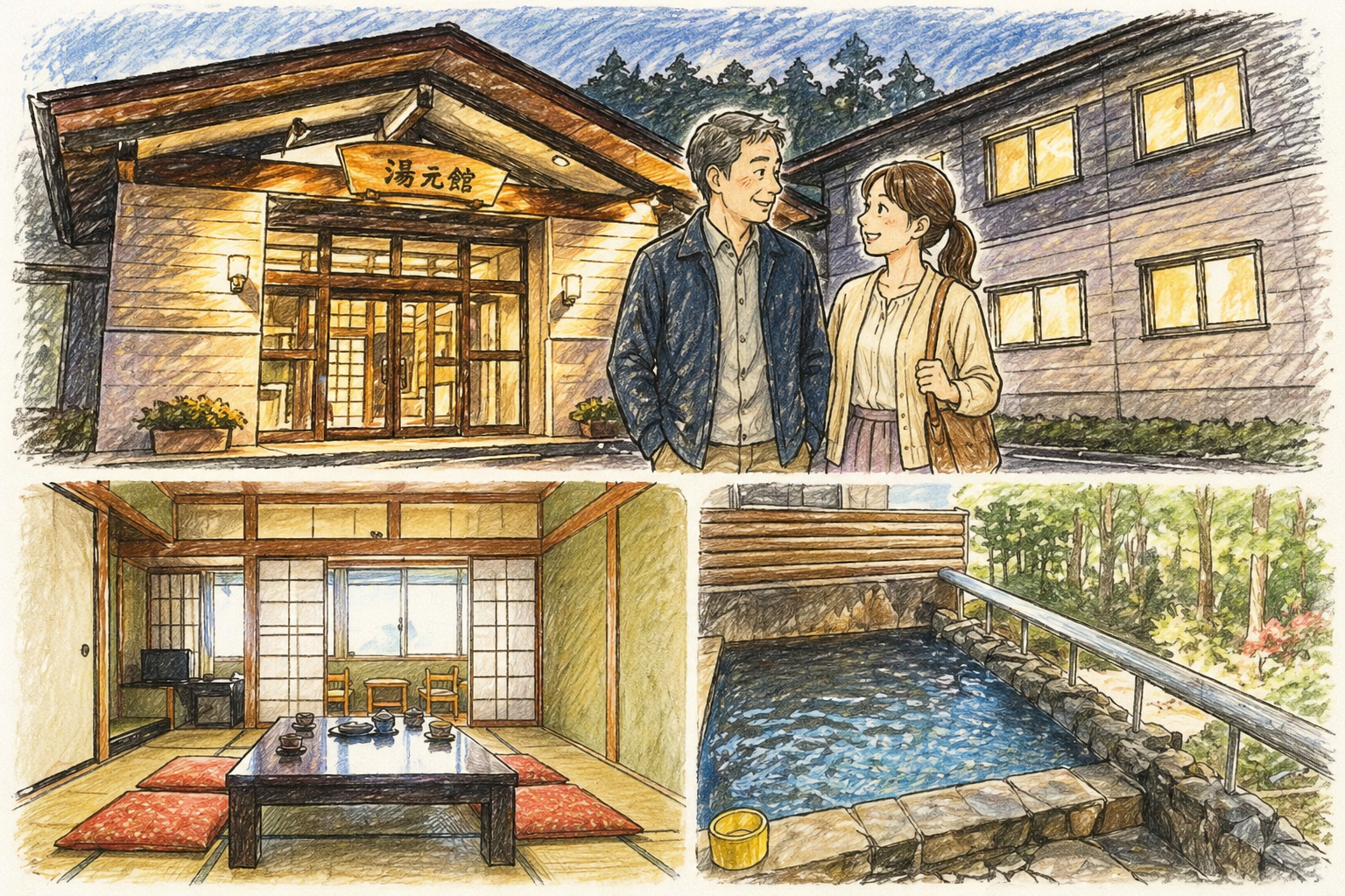 初めて行く場所は迷いやすいですよね。まずは湯元館がどんな宿なのか、温泉・食事・立地の特徴から見ていきましょう。