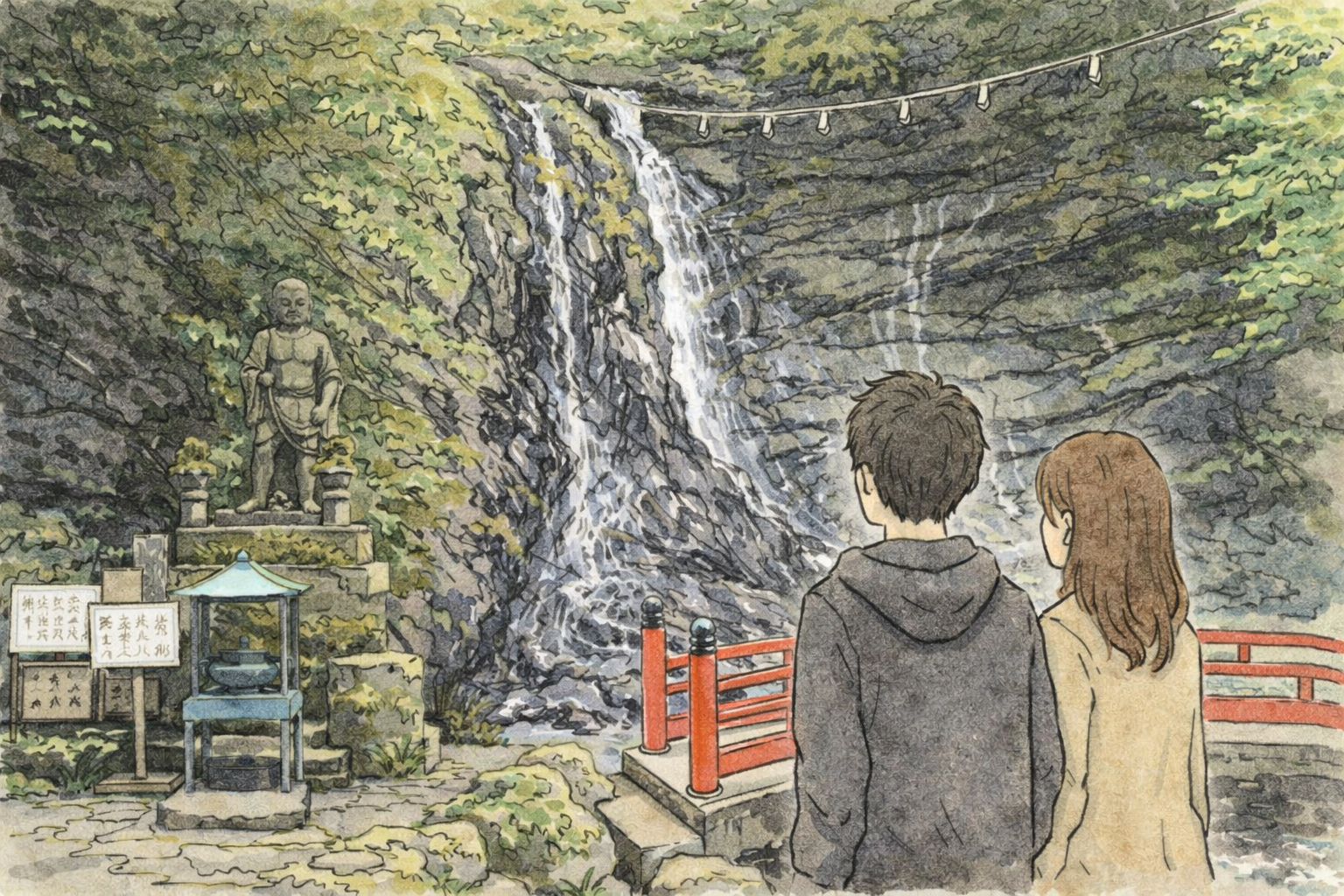 参道は、歩くほど景色が変わるのが楽しい道です。まず目に入りやすいのが赤い橋。写真に残すなら、橋の上で立ち止まるより、少し端に寄って通り道を空けるとスマートです。次に探したいのは、石や岩の不思議な形。ハートに見える石のように「見つけたらラッキー」なポイントもあります。滝の近くは水しぶきで足元がぬれやすいので、急がず小さな歩幅で進みましょう。道中には物語が伝わる場所もあり、看板を読むだけで旅の気分が深まります。疲れたらベンチや広い場所で一休み。ふたりのペースを守ることが、最後まで気持ちよく歩く秘けつです。