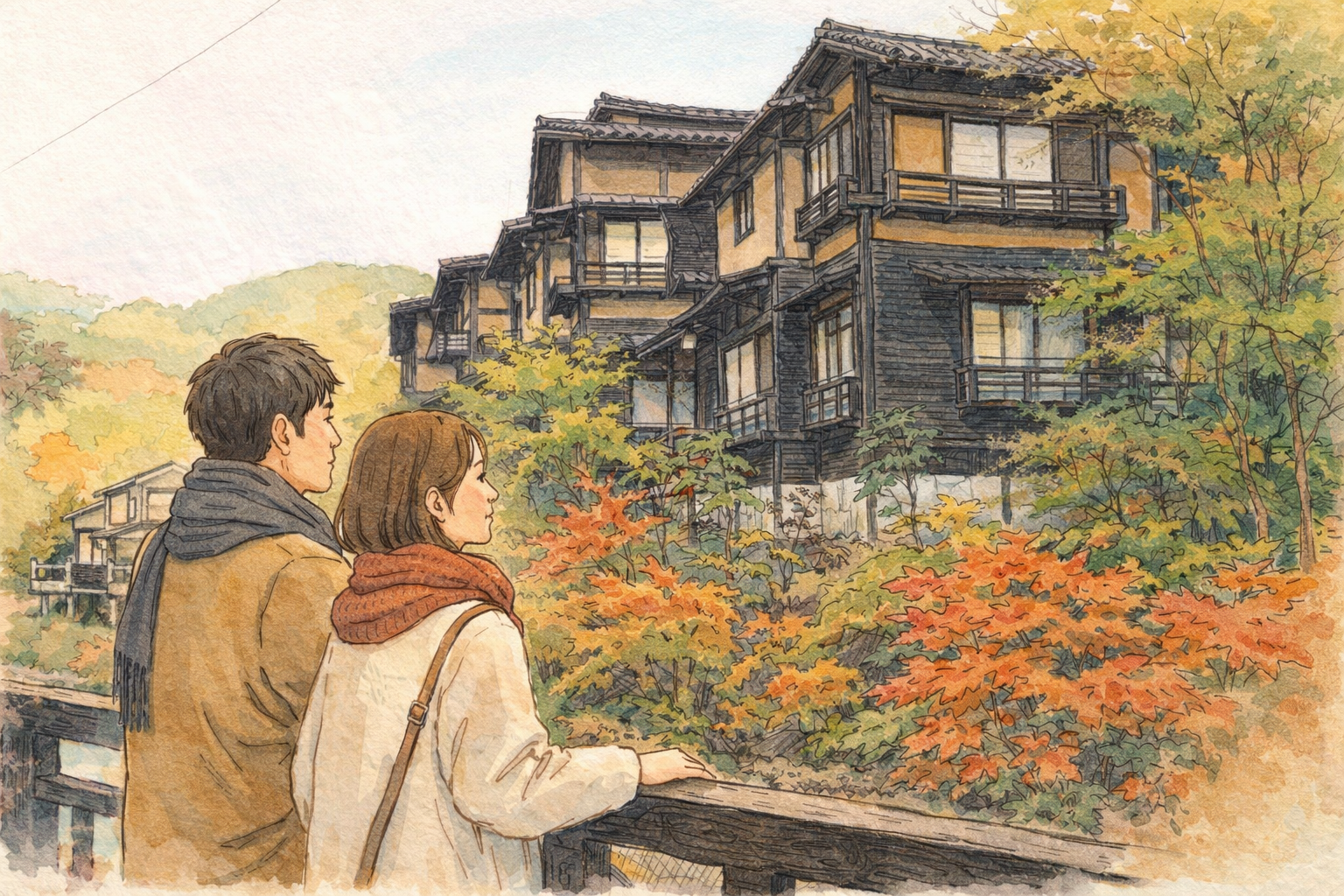 黒川温泉の秋・冬は、にぎやかな観光地を次々に回る旅よりも、二人でゆっくり空気を味わう1泊旅行に向いています。山あいならではの落ち着いた景色、しっとりした温泉街の雰囲気、宿で過ごす時間の心地よさがそろっているからです。派手さよりも静けさを楽しみたい大人のカップルにとって、無理なく特別感を感じやすい旅先といえるでしょう。