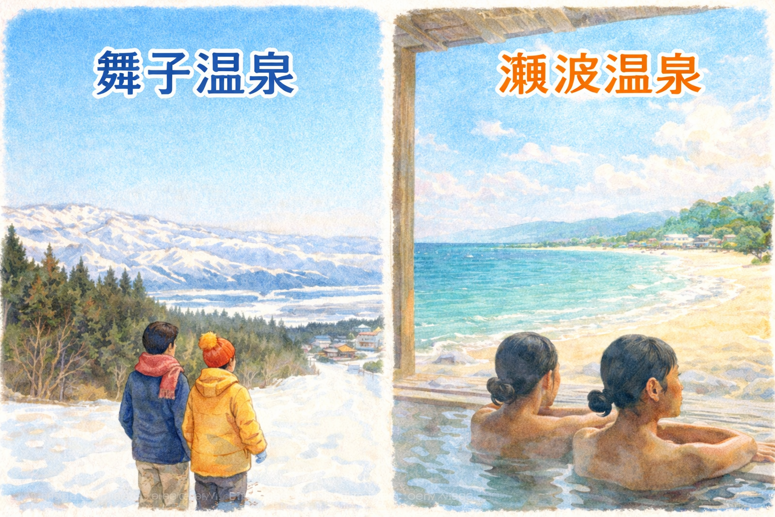 冬の新潟・舞子温泉と瀬波温泉はどちらがいい?泉質・湯量・風呂の特徴、アクセス(車、列車、バス、飛行機)、近隣観光施設やグルメまで比較し、あなたにぴったりの温泉旅を見つけましょう。