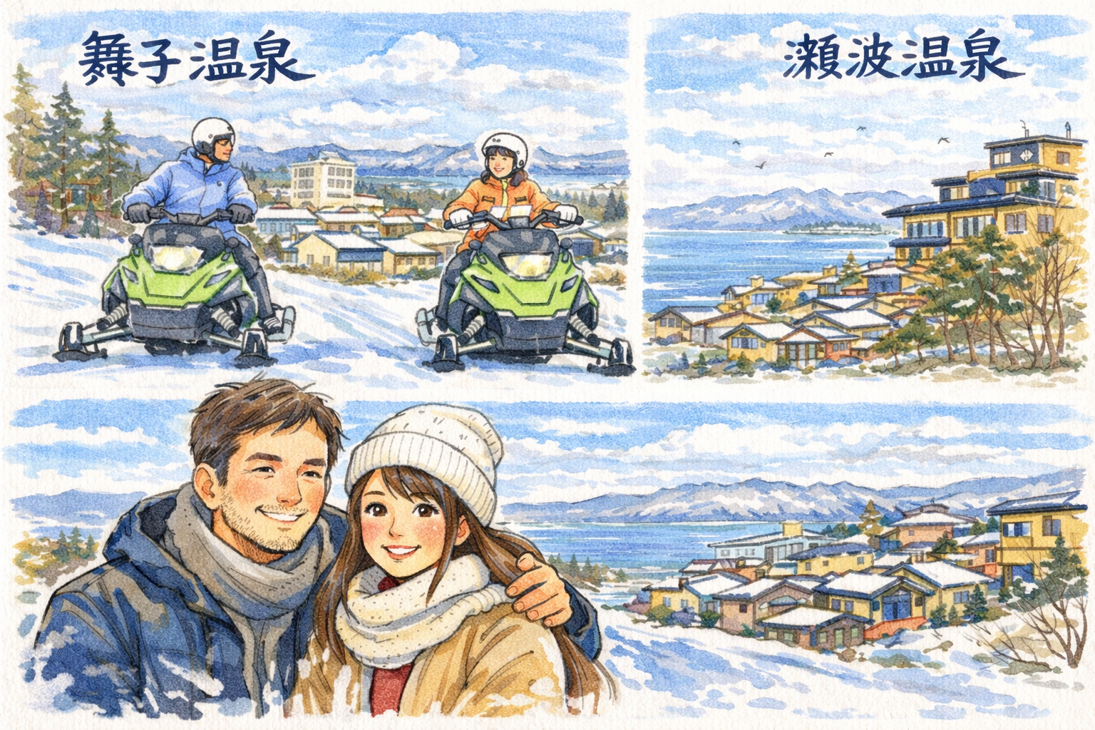 温泉旅行は「お湯に入る」だけで終わらせるのはもったいないものです。周りの観光や遊びを少し入れるだけで、思い出がぐっと増えます。舞子温泉は冬のスポーツと相性がよく、瀬波温泉は散策や文化に触れる旅が作りやすいのが特徴です。