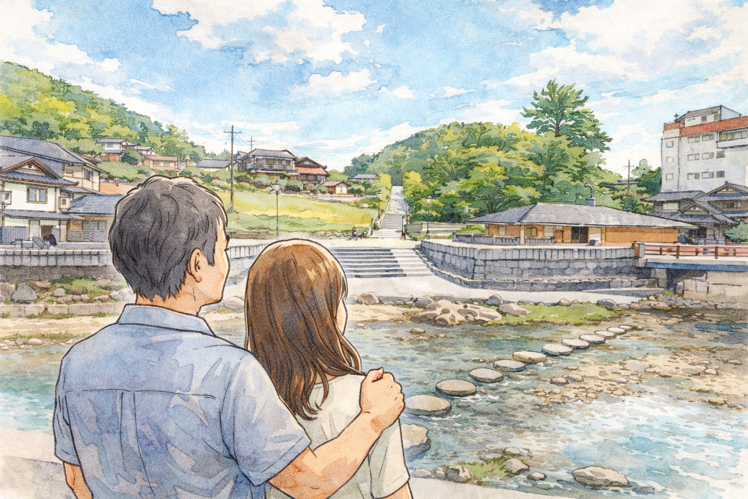 到着してすぐ宿に入る前に、川沿いを少し歩いてみると旅の気分が上がります。音信川の近くには、座って休める場所があり、景色を眺めながら深呼吸できます。移動の疲れがあるときほど、いきなり予定を詰めるより、まず“落ち着く時間”を取るほうが良いです。写真を撮るときは、二人の後ろ姿でも十分雰囲気が出ます。無理にポーズを決めるより、同じ方向を見ているだけで自然な一枚になるでしょう。歩く距離は短めにして、途中で休む前提にしておくと安心。宿に荷物を預けられるなら、身軽になって散策するのも手です。旅のはじまりをゆっくりにする、それだけで一泊旅行の満足感は変わります。