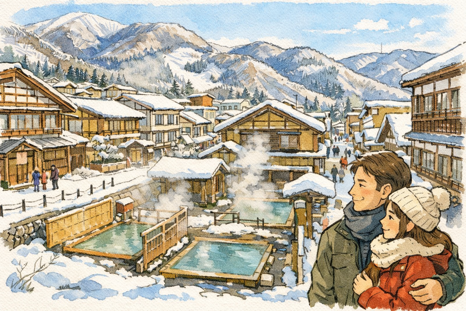 野沢温泉は、遠くまで移動しなくても温泉街の中で旅の楽しみが広がるのが魅力です。秋・冬は景色にも情緒があり、外湯や歴史あるスポットをゆっくりめぐるだけで、2人の時間がぐっと特別なものになります。