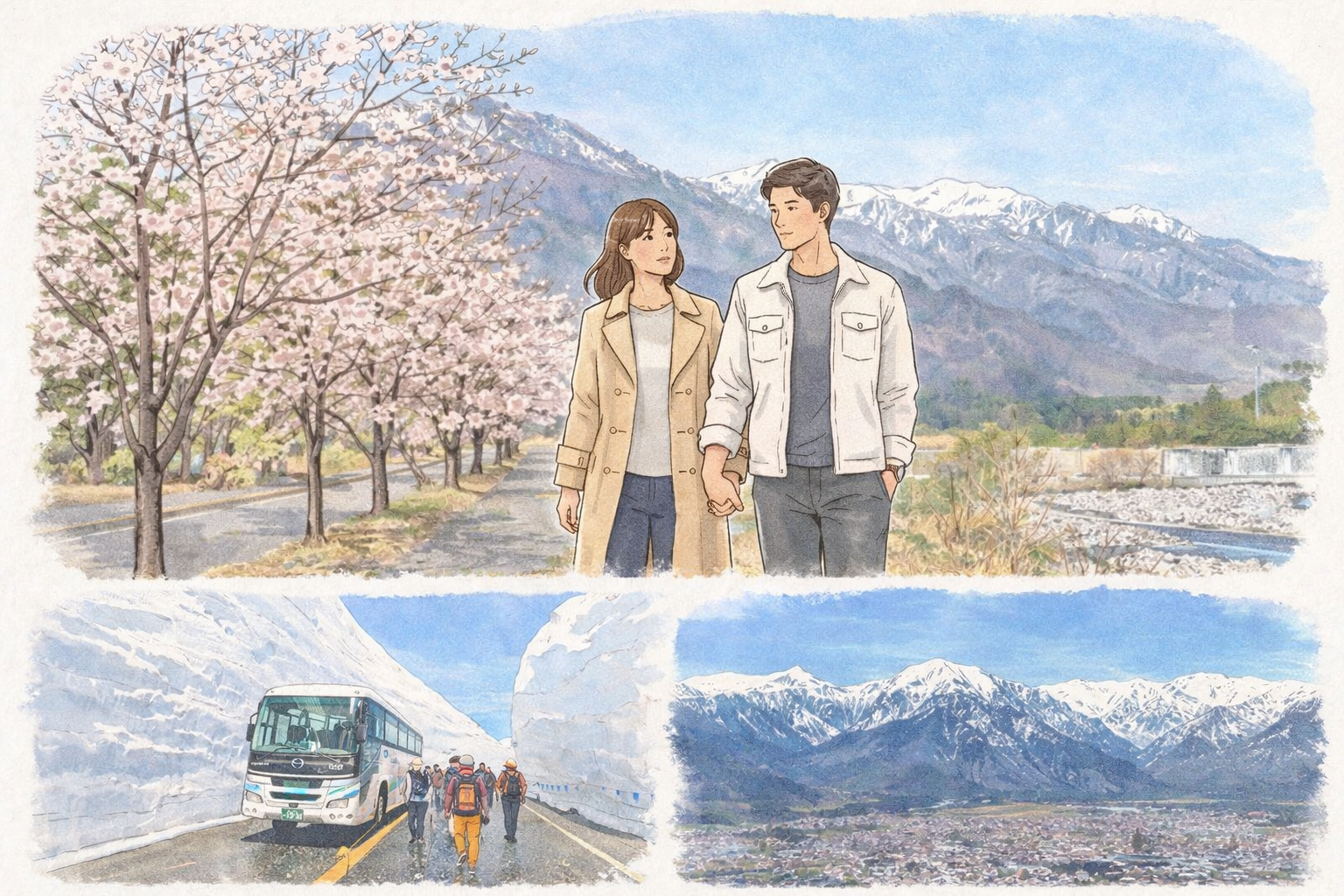 大町温泉郷の魅力は、宿だけで完結しないところにもあります。周辺には湖や高原、渓谷などがあり、季節ごとに景色が大きく変わります。とはいえ、ここで大切なのは、観光を主役にしすぎないことです。少し寄り道をして季節を感じ、そのあと宿でゆっくり過ごす。そんな流れにすると、カップルの1泊旅行がぐっと心地よくなります。春夏秋冬それぞれの楽しみ方を、宿時間と組み合わせて見ていきましょう。