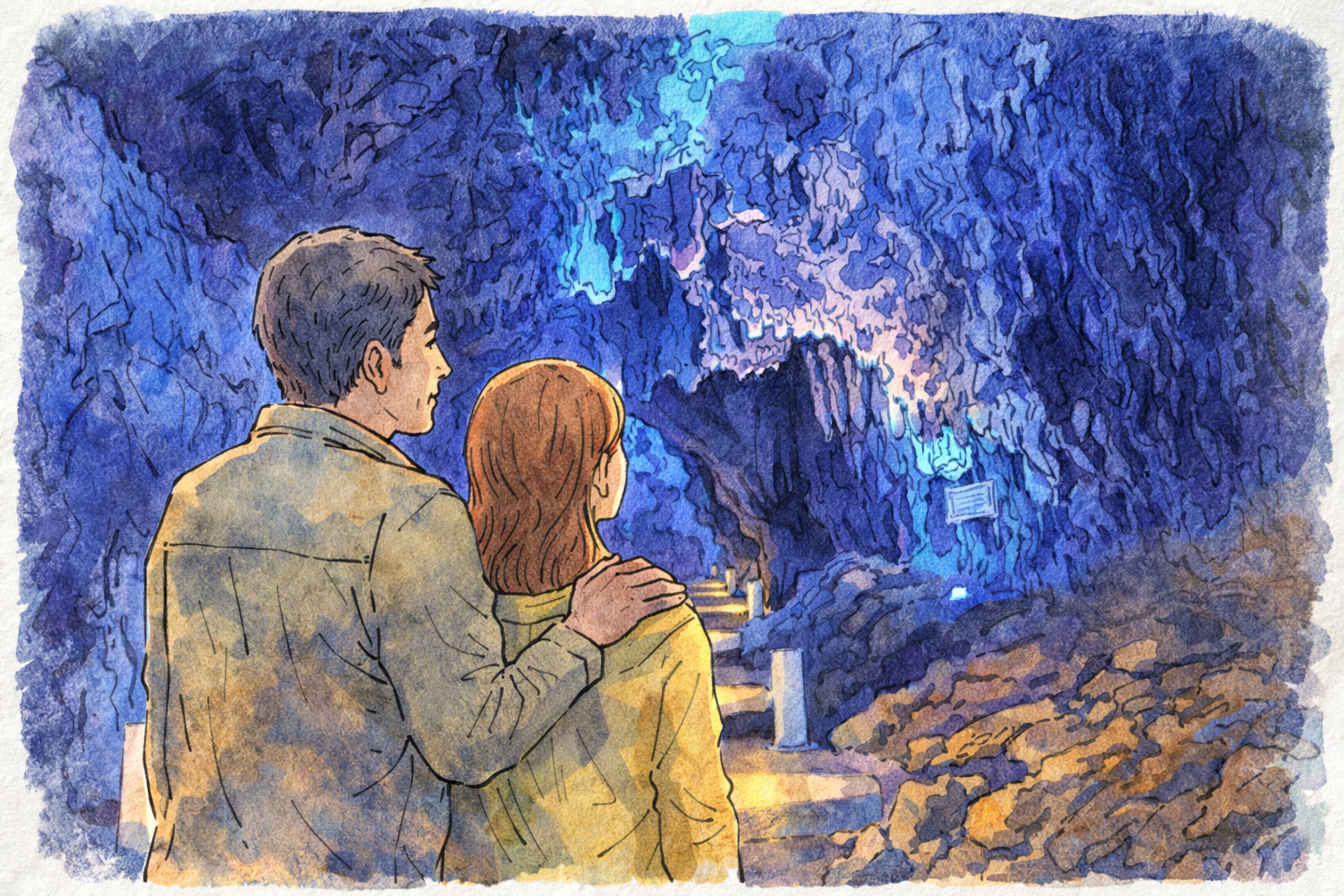 地底湖の前に立つと、思わず「すごい…」と声が出ます。青く見える水は、照明と洞窟の暗さが合わさって、特別な色に感じられるからです。写真を撮るときは、まず安全を優先しましょう。通路の真ん中で立ち止まるより、広い場所や手すりの近くで止まるほうが安心です。二人で撮るなら、スマホのタイマーを使うより、短い動画を撮ってあとで切り取る方法も便利。表情が自然になりやすいのでおすすめです。会話が途切れそうなときは、「この青、海とどっちが好き?」のような軽い質問を投げると、ふわっと空気が和らぎます。地底湖は見どころがいくつかありますが、全部を完璧に回ろうとしなくて大丈夫。前述したように、階段が多い場所もあるため、二人の体力に合わせて楽しむのが一番です。