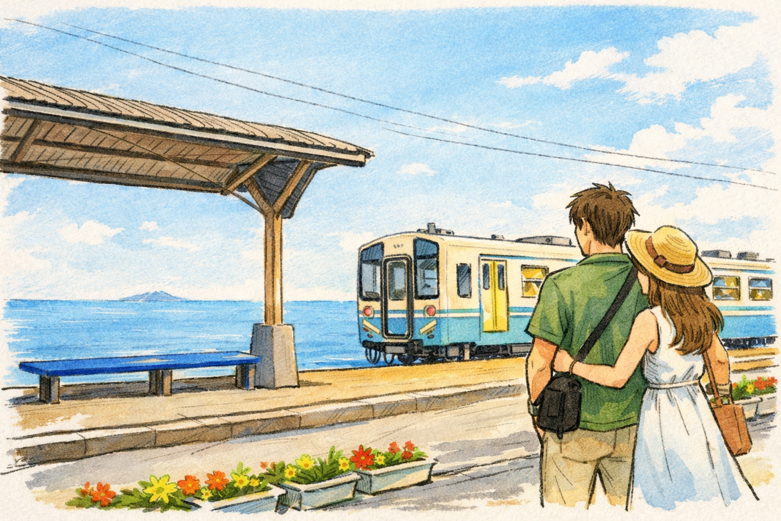 下灘駅と温泉宿を組み合わせると、旅にゆとりが生まれます。日帰りでも十分楽しめますが、一泊にすると時間に追われにくくなり、景色を味わう気持ちにも余裕が出てきます。たとえば、昼から下灘駅で海を眺め、夕方以降は温泉宿でのんびり過ごす流れなら、移動と休憩のバランスが取りやすいでしょう。翌日は朝をゆっくり始めたり、周辺を軽く回ったりと、予定を詰め込みすぎずに楽しめます。カップル旅では、たくさんの場所を回ることより、心地よく過ごせる時間が思い出に残ることも少なくありません。下灘駅の絶景と温泉のくつろぎは、その両方をかなえてくれる組み合わせです。記念日のおでかけにも、肩ひじ張らない小旅行にも向いています。